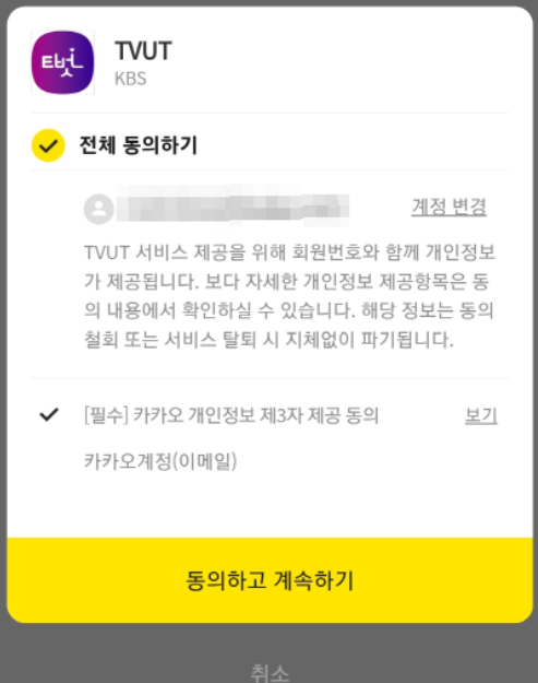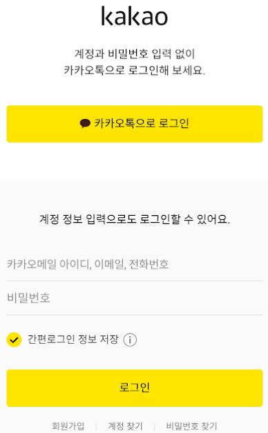저는 카카오로 시작하기를 통해 진행을 해봤습니다. 카카오로 시작하기를 누르시면 아래와 같은 화면이 뜨고 카카오톡으로 로그인이 가능합니다.