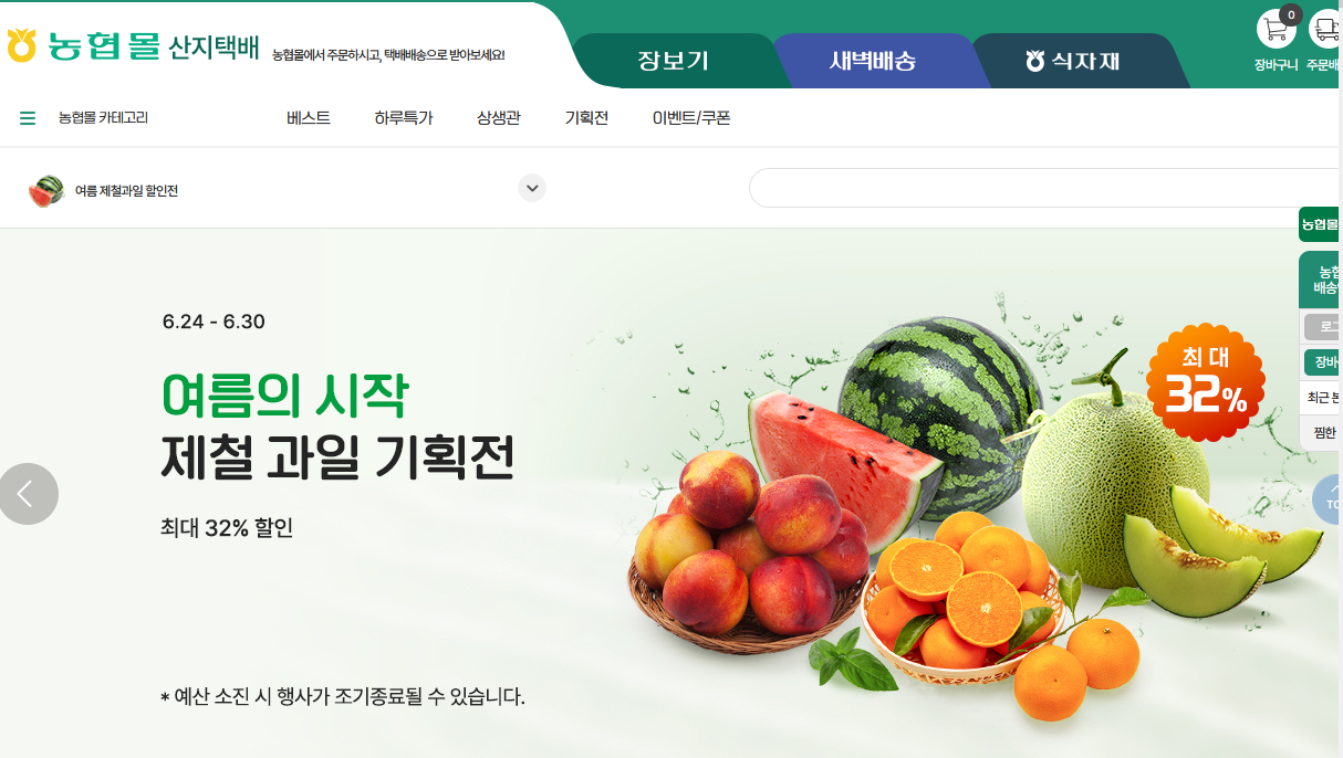 - 상품 종류: 제철 과일, 신선 채소, 양곡, 정육, 간편식 등 다양한 신선식품을 취급합니다.